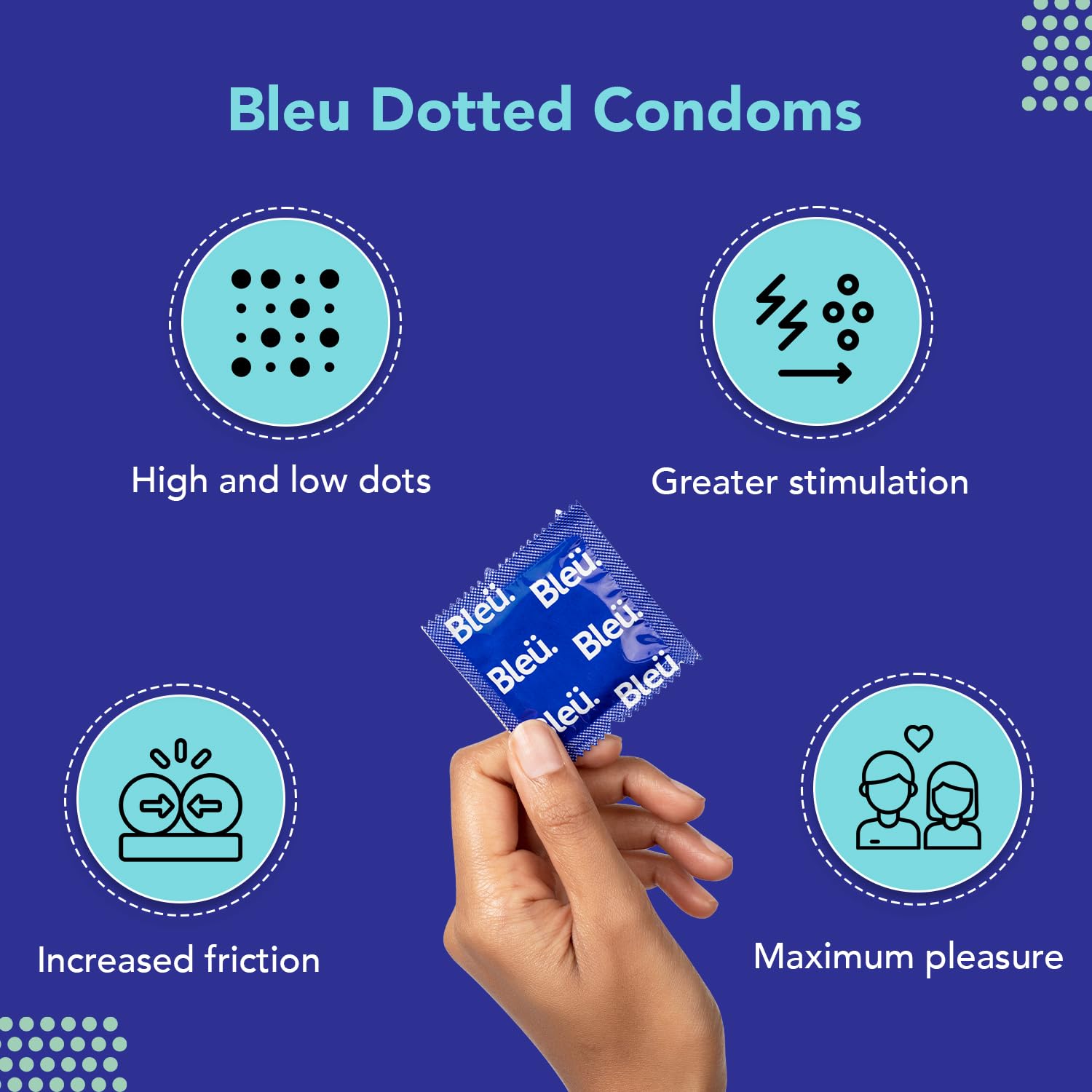 Bleu dotted condoms are especially for those who want all the fun only making sure that it’s a healthier option. We have made sure that extra high dots have been placed in a strategic points to increase the pleasure for Non Toxic Condom lovers.