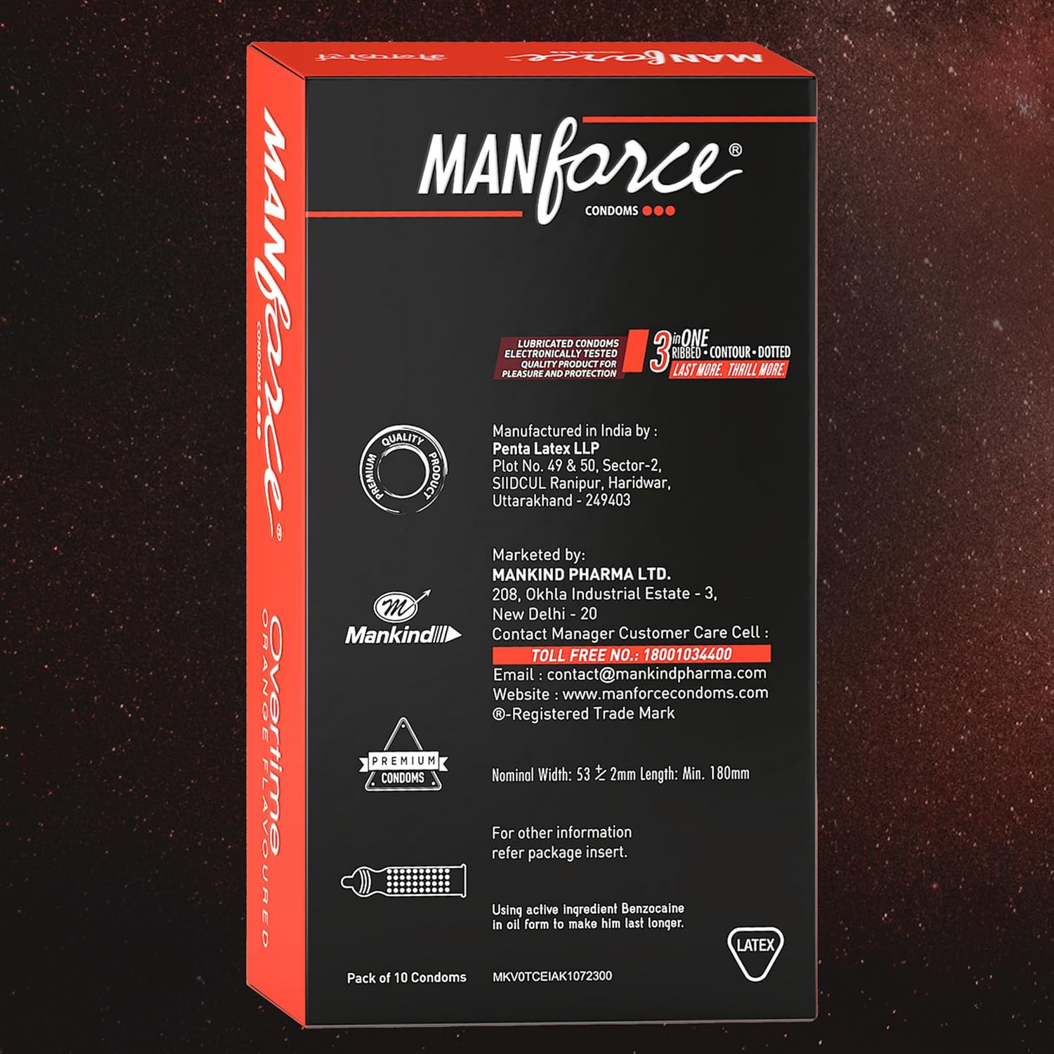 - RIBBED-CONTOUR DOTTED CONDOMS WITH LONG LASTING PLEASURE: Manforce Overtime 3in1 Condoms work wonders during lovemaking with added advantage of 4.5% Benzocaine Oil to make him go on for longer